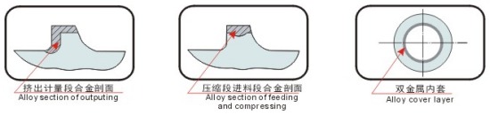 雙合金機(jī)筒就是在機(jī)筒內(nèi)壁澆鑄一層2-3mm的耐磨、耐腐蝕、耐高溫的合金。其有效使用壽命比普通氮化機(jī)筒大大提高,對于加工工程塑料、氟塑料、聚砜、PPO特殊類型的塑料等,雙合金的優(yōu)越性尤為明顯。